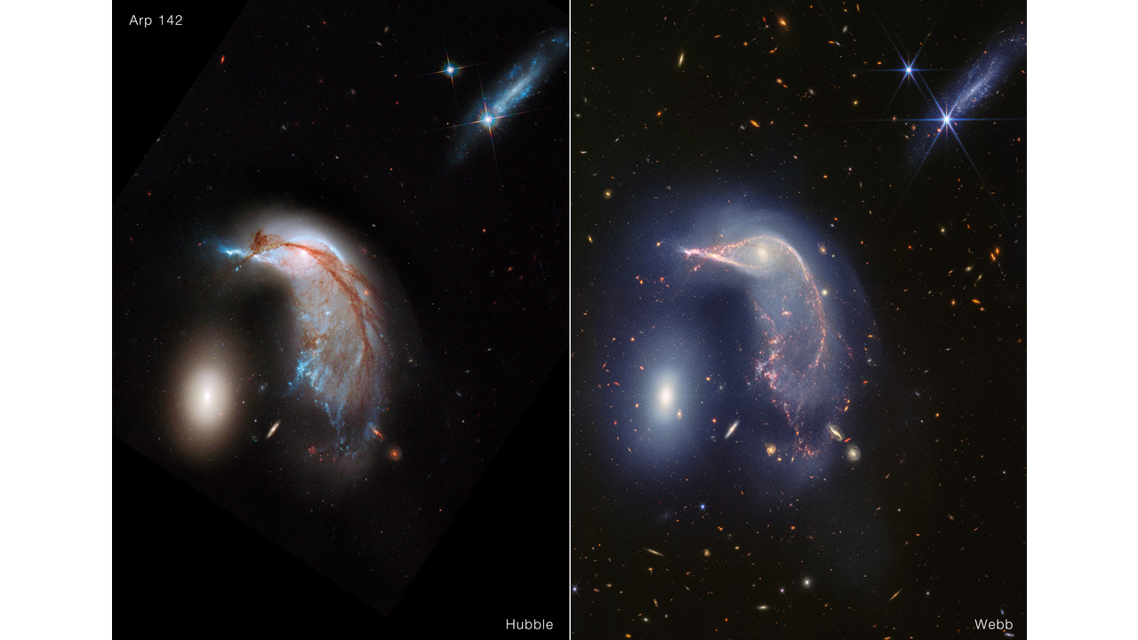 Sadece James Webb Uzay Teleskobu’nun kızılötesi görüşü ile bakıldığında, iki galaksi uzayın boşluğunda birleşiyor şeklinde görünüyor. Hubble’ın yakaladığı görselde yer edinen, Penguen’in gövdesindeki kırmızı-kahverengi damarımsı görüntü Webb Teleskobu karesinde kaybolurken, Yumurta’ya onu bağlayan bir pus da kemer şeklinde uzanıyor.