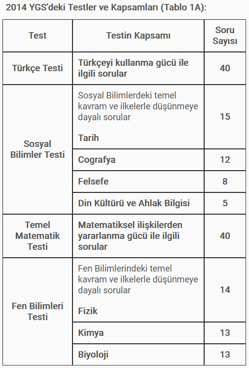 2014 ÖSYS Başvuru Kılavuzuna göre, bu yıl başvuruda bulunan adaylara YGS’de Türkçe’den 40, Tarih’ten 15, Coğrafya’dan 12, Felsefe’den 8 ve Din Kültürü ve Ahlâk Bilgisi’nden 5, Temel Matematik’ten 40, Fizik’ten 14, Kimya’dan 13, Biyoloji’den ise 13 tane soru sorulacak.