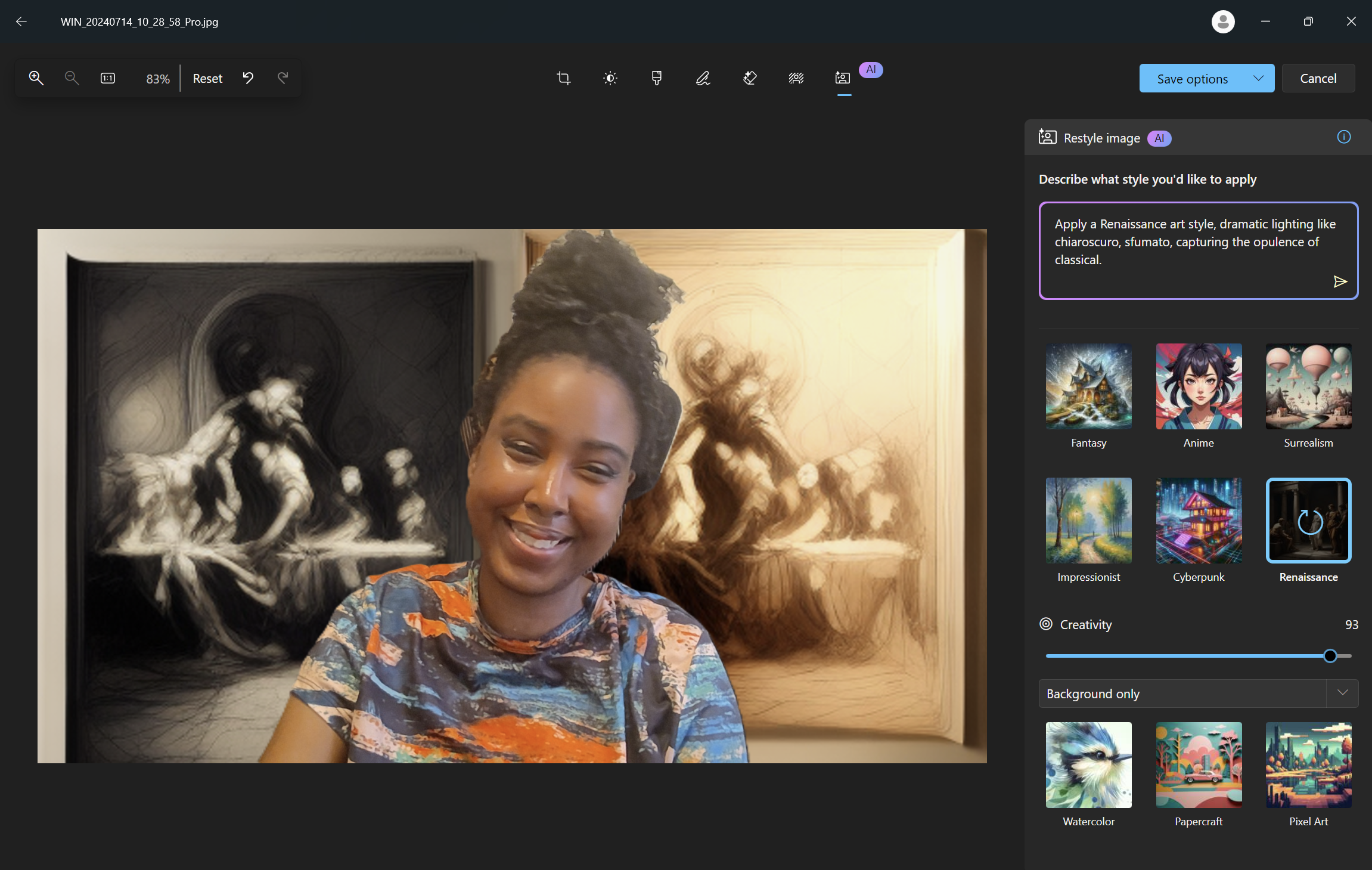 Çektiğimiz selfie’yi, suni zeka ile güçlendirilmiş Fotoğraflar uygulamasıyla “Rönesans” tarzına döndürdük.