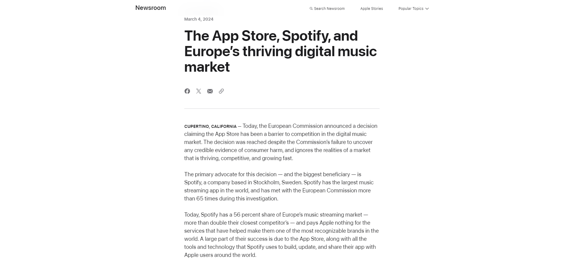 Apple açıklamasında “İronik bir halde, rekabet adına bugünkü karar, dijital müzik pazarının kaçak lideri olan başarıya ulaşmış bir Avrupa şirketinin hakim konumunu pekiştiriyor” ifadelerine yer vermekte.