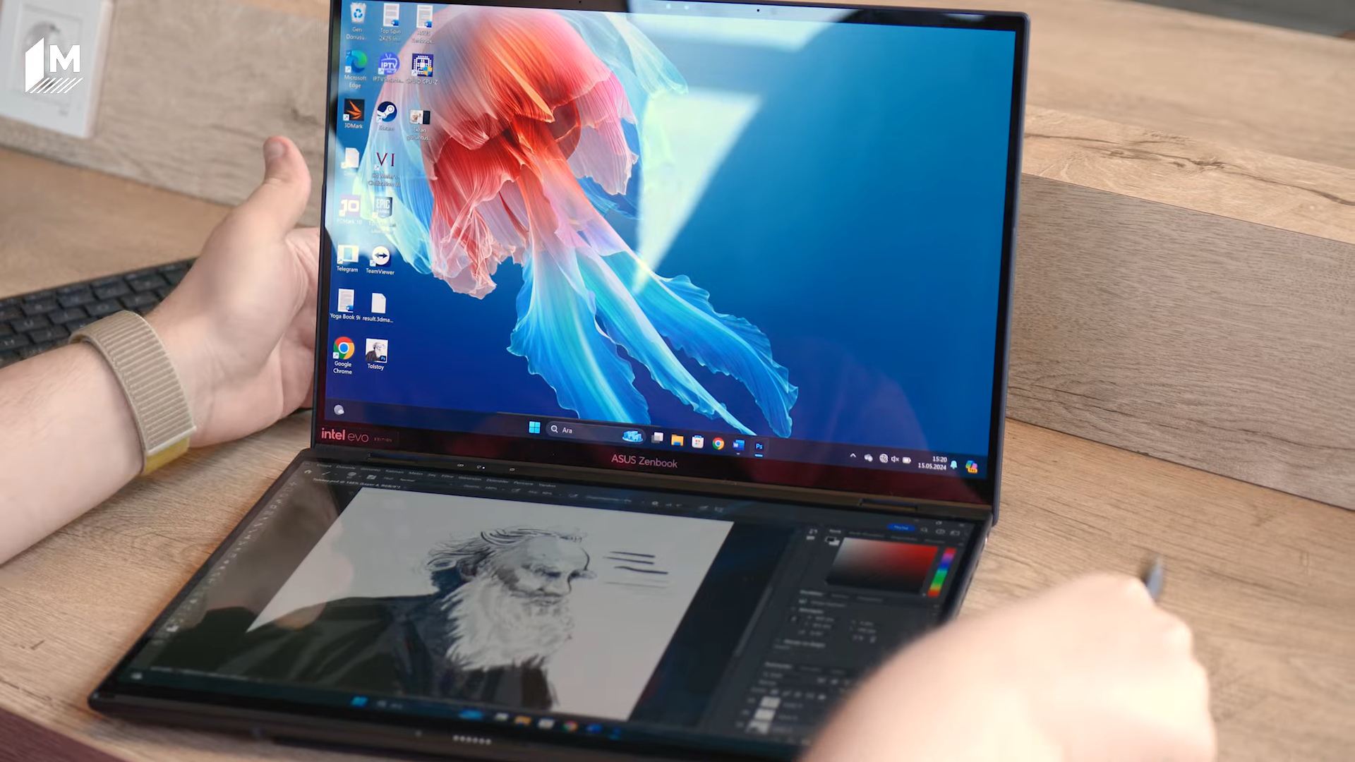 ASUS Zenbook Duo’nun yanında gelen kalemden de anlatmak isterim. ASUS Pen 2.0 adındaki kalem, 4096 baskı seviyesine haiz. Doğrusu kalemle çizim yaparken ne kadar baskı uygularsanız, aynı gerçek bir kalemdeki şeklinde daha koyu çizmeye başlıyorsunuz. İçerisinden üç değişik kalem ucu da çıkan kalem, bu sayede her ne kadar aşırı üst düzey bir çizim imkânı sağlamasa da, Lenovo Yoga Book 9i Gen8’de deneyimlediğimiz şeklinde de oldukca giriş seviyesinde de değil. Doğal burada ekranın tamamen ıslak olmasının da tesiri var. Çoğu zaman çizim meydana getirilen tabletlerin yüzeyleri mat ve kâğıdın sağlamış olduğu sürtünme hissiyatını yaratmayı hedefliyor. Sadece Zenbook Duo’da bu şekilde bir his oluşmuyor. Bu da ustalaşmış kullanıcılar için çizim hissiyatını giriş seviyesiyle ustalaşmış kullanım içinde bir noktaya yerleştiriyor. Gene de ortalama 100 bin TL’lik fiyatında bu şekilde bir ekstranın da bulunuyor olması, büyük bir artı yön.
