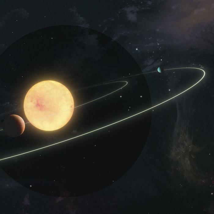 TOI-1789 yıldızının çevresinde dönen iki dış gezegenin bir sanatçı tarafınca tasviri. Bulunan süper-Dünya daha iç yörüngede yer edinen gezegen.