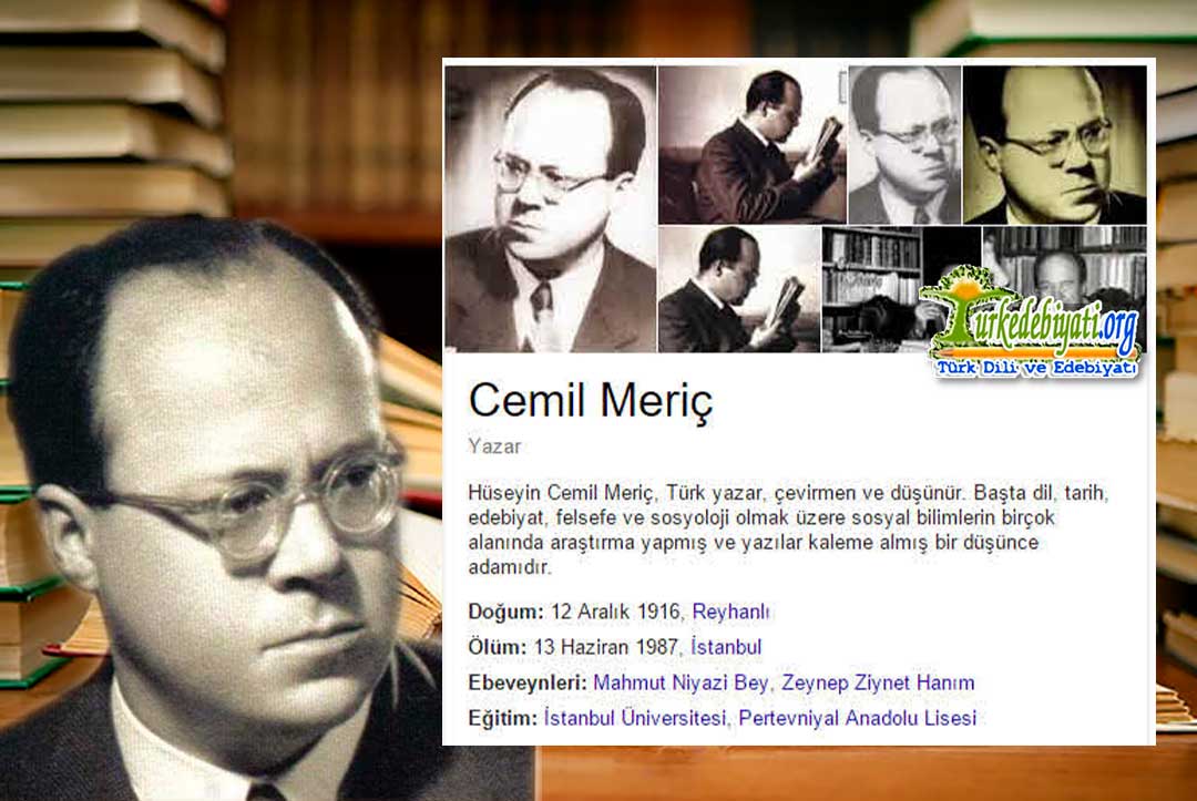 Cemil Meriç, yazar ve mütercim. Asıl ismi Hüseyin Cemil Meriç’tir. 12 Aralık 1916’da Hatay Reyhanlı’da doğdu. Ailesi Balkan Savaşı sırasında Yunanistan’dan göçmüştü. Fransız idaresindeki Hatay’da Fransız eğitim sistemi uygulayan Antakya Sultanisi’nde okudu. Bir süre ilkokul öğretmenliği ve nahiye müdürlüğü, Tercüme kaleminde reis muavinliği yaptı.