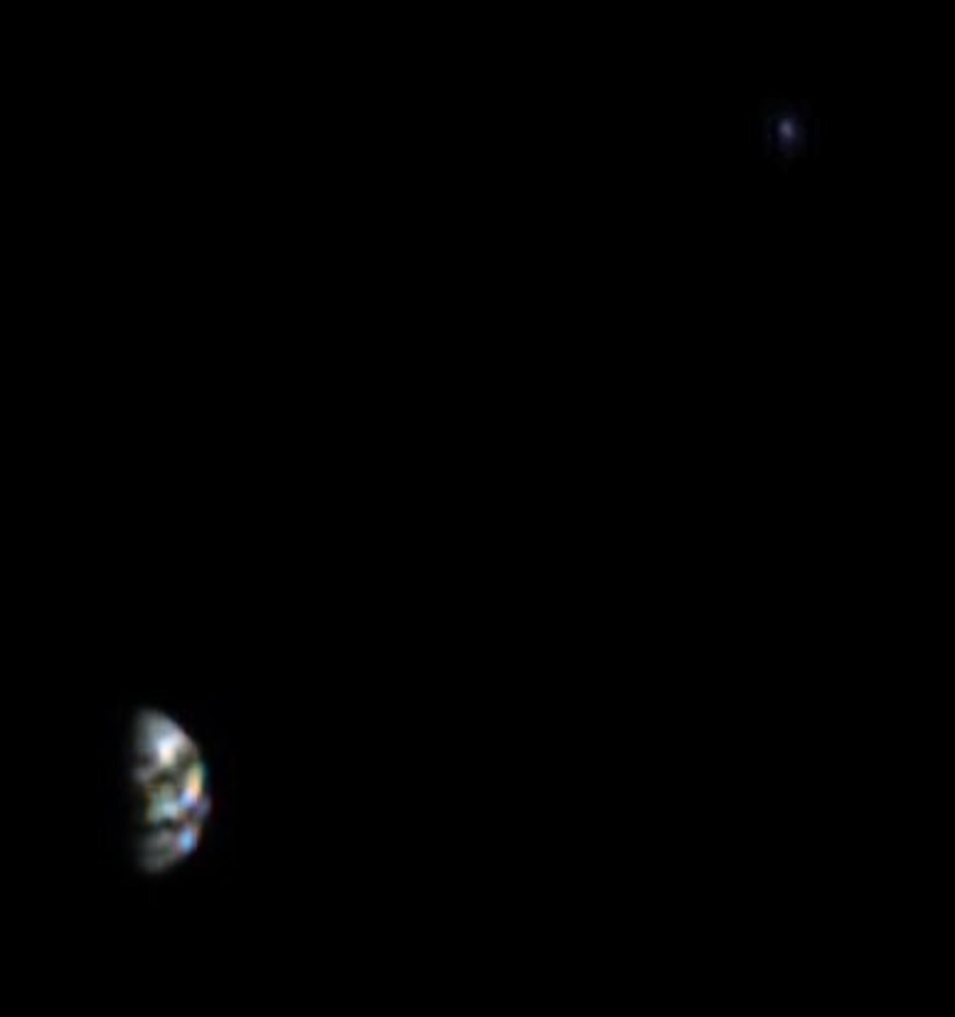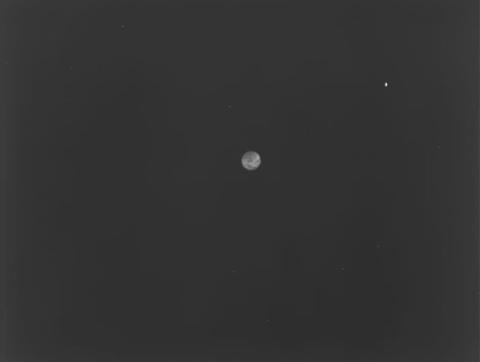 Aşağıdaki ilk fotoğraf, Hera’nın Asteroit Soruşturma Kamerası ile çekildi ve Güneş’in aydınlattığı Pasifik Okyanusu’ndaki beyaz bulutları, ortalama 1,6 milyon kilometre öteden gösteriyor. Fotoğrafın ortasına yakın olan cisimse, yaklaşık 384 bin kilometre ötedeki Ay.