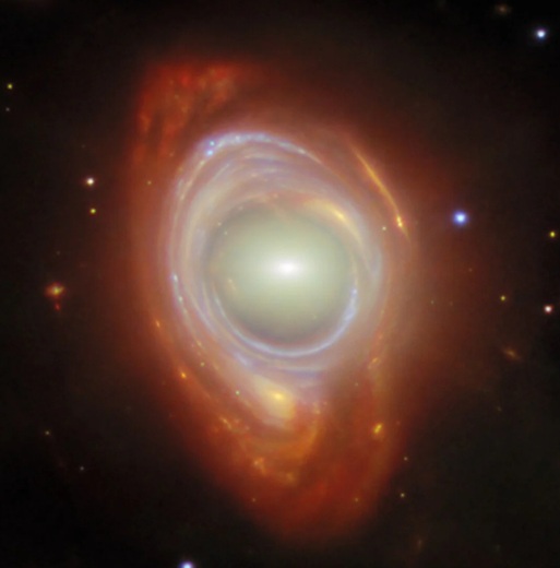 SMACS J0028.2-7537 eliptik galaksisi, Einstein halkası etkisiyle daha uzak bir galaksiyi büküyor. Fotoğraf: JWST, ESA, NASA, CSA