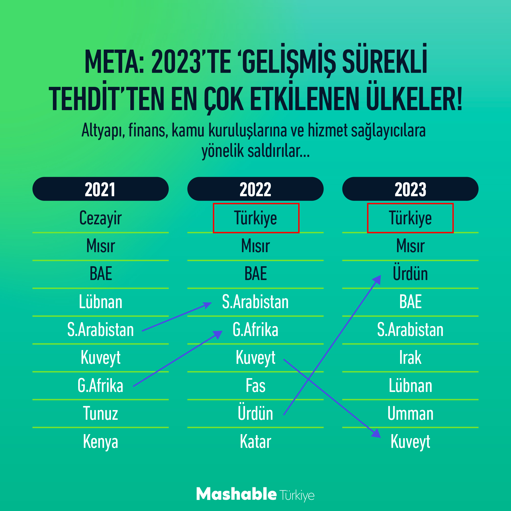 Gene Kaspersky verilerine nazaran Gelişmiş Devamlı Tehdit (Advanced Persistent Threat – APT) saldırılarında 2021’de META’da ilk 9 ülke içinde yer almayan Türkiye, 2022 yılından itibaren listenin en üzerine yerleşti.