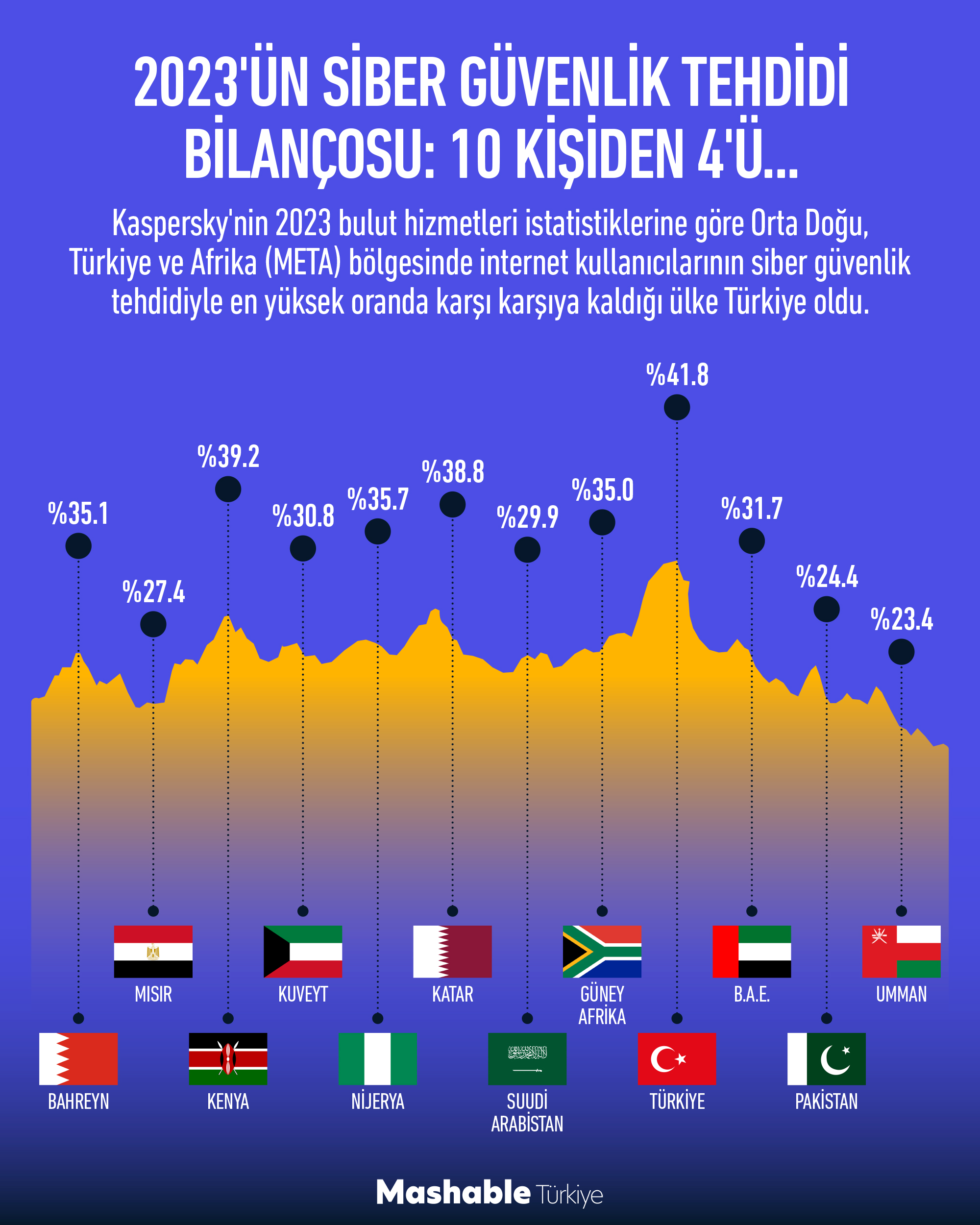 META bölgesinde çevrimiçi tehditlerden etkilenen en yüksek kullanıcı sayısı Türkiye’de görülürken (%41,8), onu Kenya (%39,2), Katar (38,8) ve Cenup Afrika (%35) takip etti. Umman (%23,4) ve Mısır’da (%27,4) daha azca kullanıcı saldırılardan etkilenirken, bunu Suudi Arabistan (%29,9) ve Kuveyt (%30,8) takip etti.