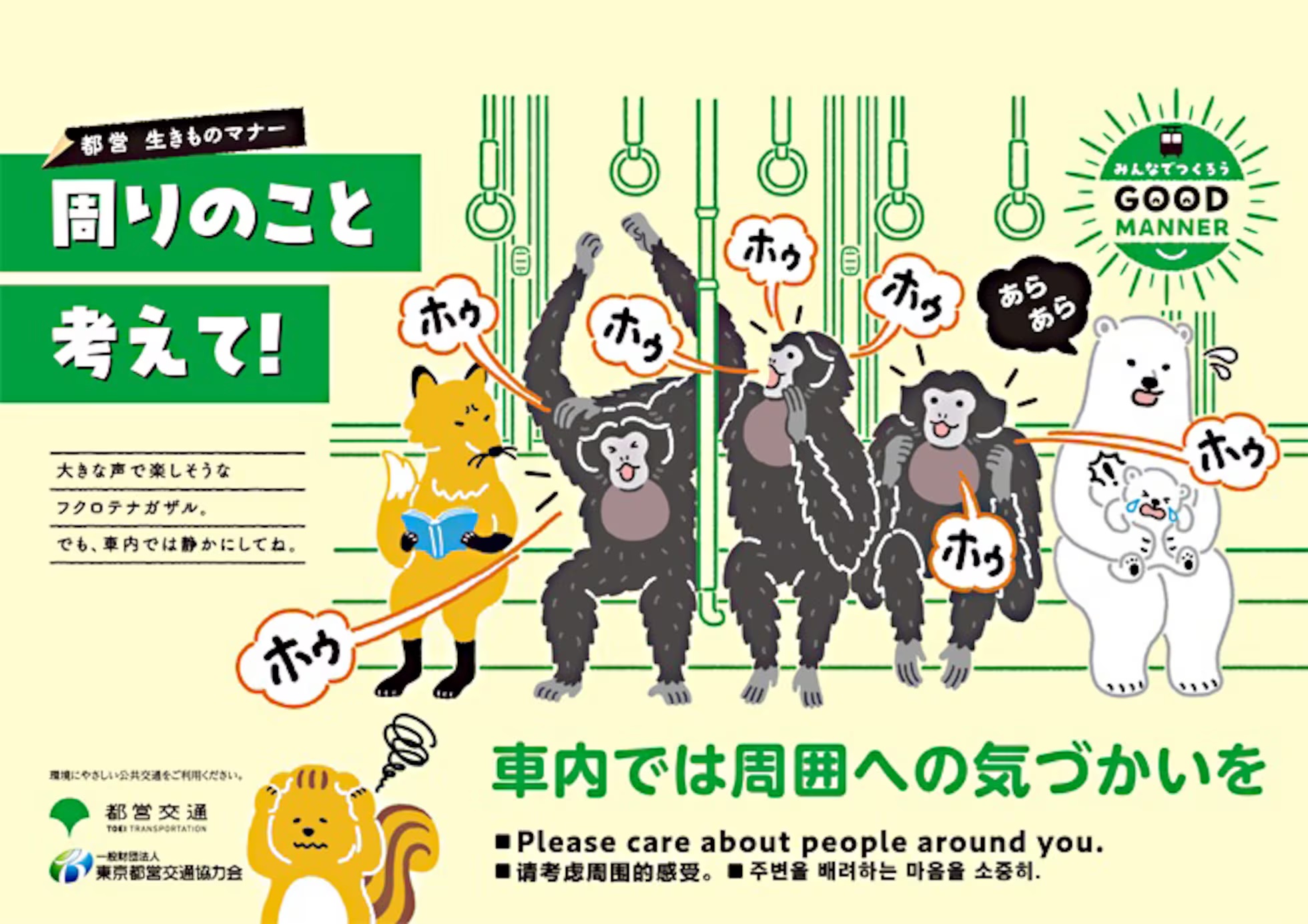 Aynı görüntüler, merkezi metro güzergahlarında yeniden yeniden görülüyor ve ulaşım şirketleri posterlerle farkındalık kampanyaları yürütüyor. Toei Transportation şirketinin asmış olduğu bir tabelada, bir vagonun içinde bağıran üç maymun, yanlarında kitap okumaya çalışan bir tilki, korkmuş yavrusunu teselli eden bir kutup ayısı ve öfkeyle ellerini başının üstüne koyan bir sincap görülüyor. “Lütfen etrafınızdaki insanlara kıymet verin” yazan poster, ülkedeki turistlerin iki ana milliyeti olan Çince ve Korece’nin yanı sıra İngilizce’ye de çevrildi. Şirket kampanya ile amaçlarını “yolculara rahatlık sunmak ve uyum yaratmak” şeklinde ifade ediyor.