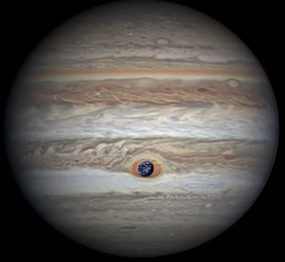 Büyük Kırmızı Nokta’nın Nisan 2017’den bir görüntüsü. Ölçeklendirilmiş bir halde bu devasa fırtına içinde Dünya’nın iyi mi bir alan kapladığı görülüyor.
