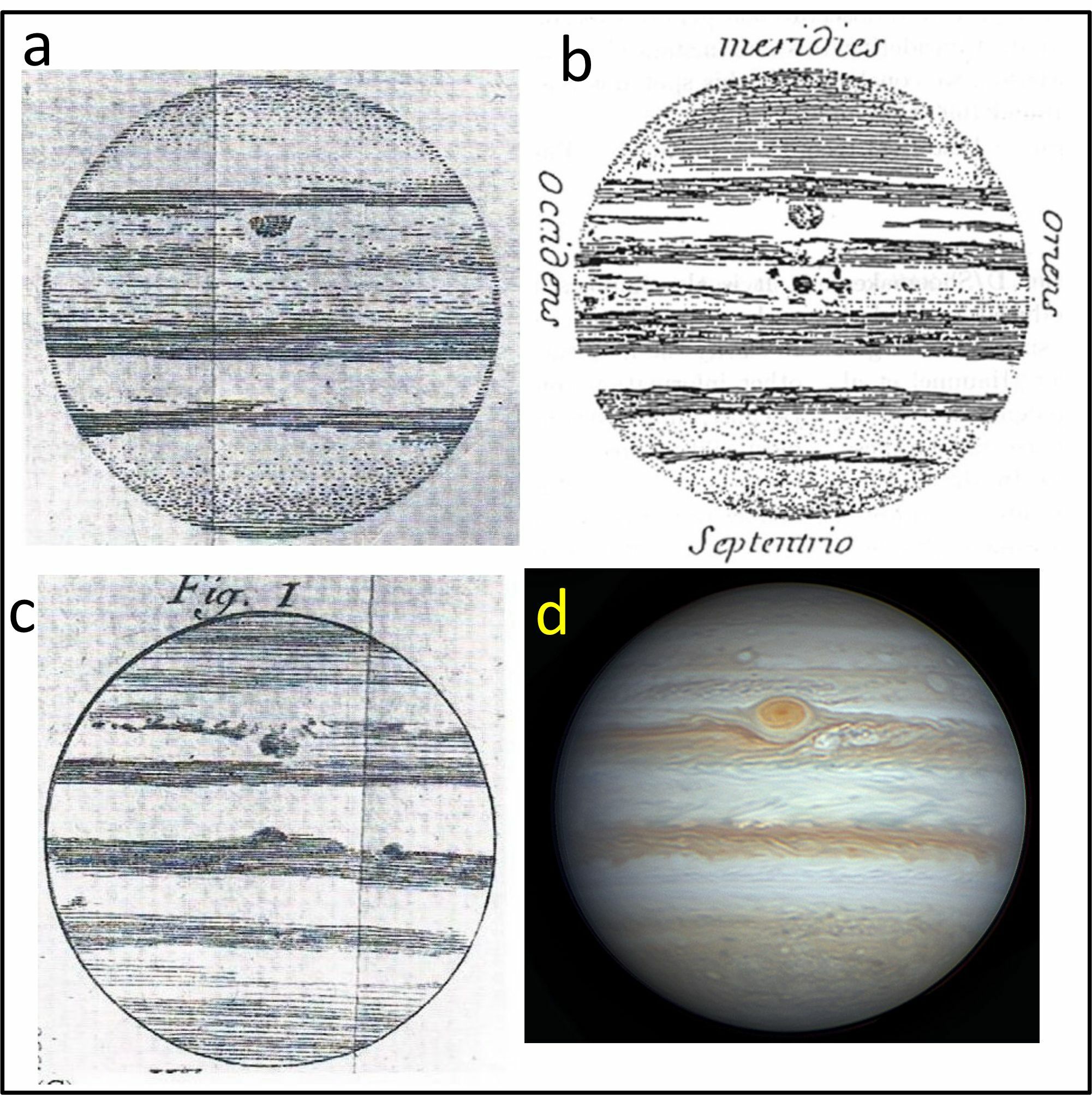 A, B ve C’deki görseller İtalyan gökbilimci Giovanni Domenico Cassini’nin sırasıyla 1677, 1690 ve 1691’de yapmış olduğu “Kalıcı Nokta” çizimlerini gösteriyor. D’de yer edinen görsel ise Büyük Kırmızı Nokta’nın 2023’ten bir görüntüsü.