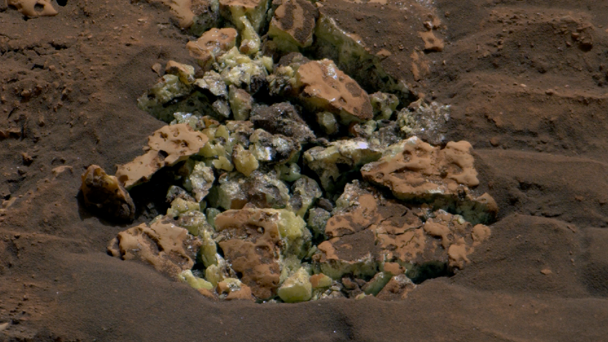 899 kilogram’lık aracın ezdiği taşın içinden sarı kristaller kısaca kükürt (sülfür) çıktı. Her ne kadar sülfatlar Kızıl Gezegen’de yaygın şekilde bulunsa da Mars’ta ilk kez kükürtün saf element halinde bulunması, Curiosity’nin bu “kazara” gerçekleşen keşfiyle tespit edildi.