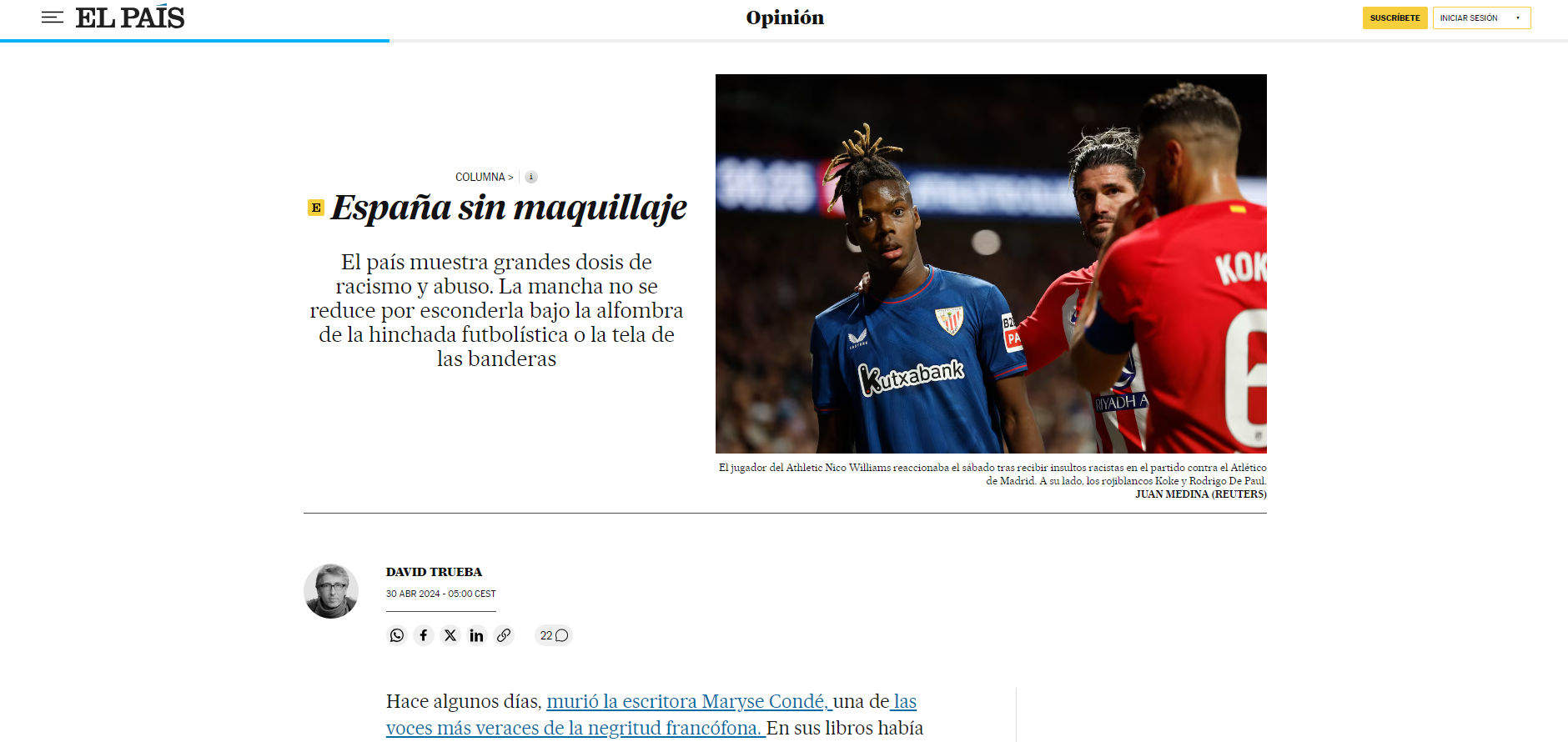 Sadece her şey toz pembe değil. Spot ışıkları bir tek aydınlatmakla kalmaz kimi zaman rahatsız da edebilir. Bu senenin Nisan ayının sonlarında Athletic ile Atletico Madrid, Madrid’de Wanda Metropolitano’da bir araya gelirken maça Nico aleyhindeki ırkçı tezahüratlar damga vurdu. El Pais bu vakası fazlaca çarpıcı bir başlıkla “España sin maquillaje” (Makyajsız İspanya) ifadesiyle ele alırken Nico oldukça olgun bir bildiri vererek “Ten renginiz yüzünden size hâlâ hakaret etmeleri düzgüsel değil” diyordu. 30 Nisan tarihindeki yazıyı kaleme alan David Trueba, “Ülkede yüksek dozda ırkçılık ve istismar görülüyor. Bu kir halının ya da futbol taraftarlarının bayraklarının altına gizlemekle azalmaz” ifadelerine yer veriyordu.