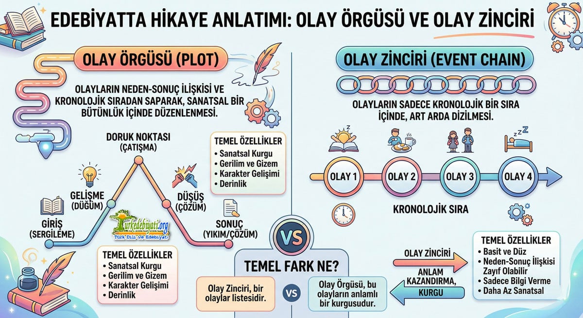 Bu iki kavram arasındaki farkı netleştirmek için en kısa yol şudur: Vaka zinciri, olayların sırasıdır; vaka örgüsü, bu sıralamanın anlamlı bir kurguya dönüşmüş hâlidir. Biri daha oldukça görünür akışı verir, diğeri ise bu akışın yapısal mantığını açıklar. Öğrencilerin en oldukça zorlandığı nokta da tam burasıdır. Bundan dolayı iki kavram birbirine yakın görünür; fakat çözümleme düzeyleri farklıdır.
