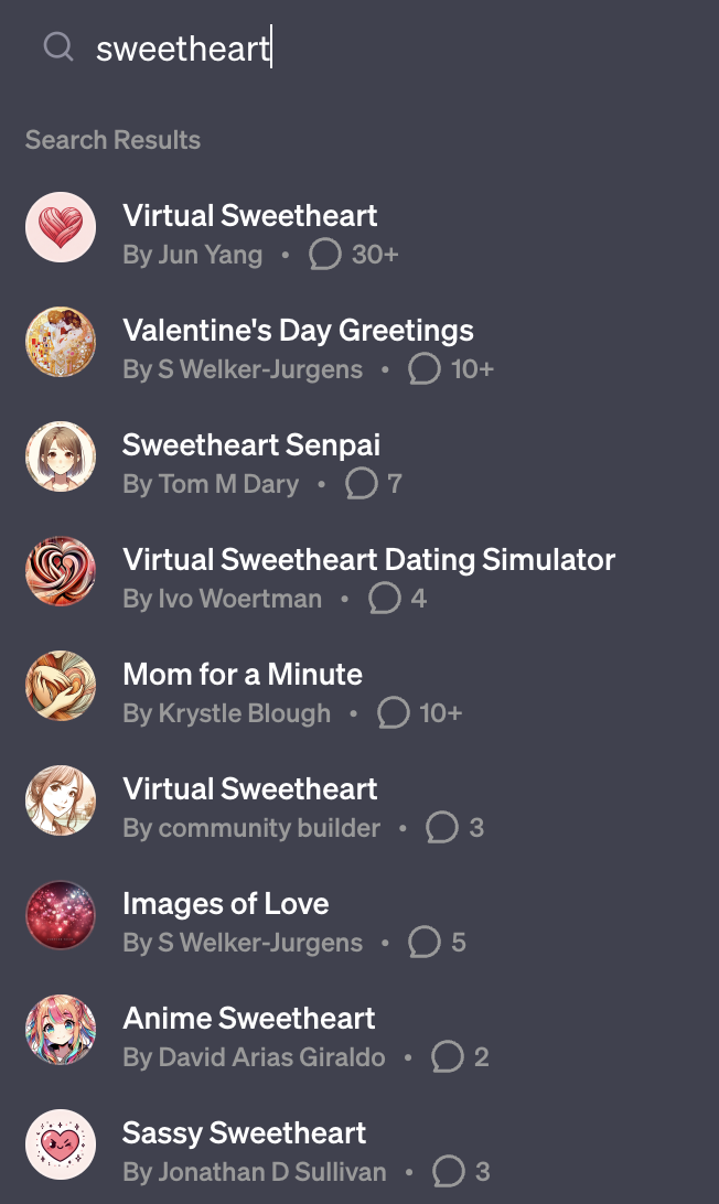 Quartz’ın geçtiğimiz Perşembe günü gözlemlediği kimi “kız dost” robotları ise sonrasında erişilemez hale geldi. Sadece GPT üreticilerin de isimlerde daha yaratıcı hale geldiği ve “kız dost” anlamındaki “girlfriend” yerine “sevgili” olan “sweetheart” ve onunla ilişkili isimlere yöneldiği görüldü: