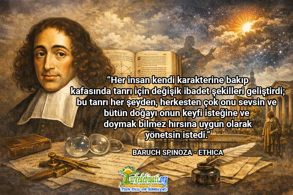 – Her insan kendi karakterlerine bakıp kafasında Tanrı için değişik yakarma şekilleri geliştirdi; bu Tanrı her şeyden, herkesten fazlaca onu sevsin ve tüm doğayı onun hazzı isteğine ve doymak bilmez hırsına uygun olarak yönetsin istedi. İşte bu önyargı sonradan batıl inanca dönüştü ve insan zihninin derinlerine kök saldı. (Etika)