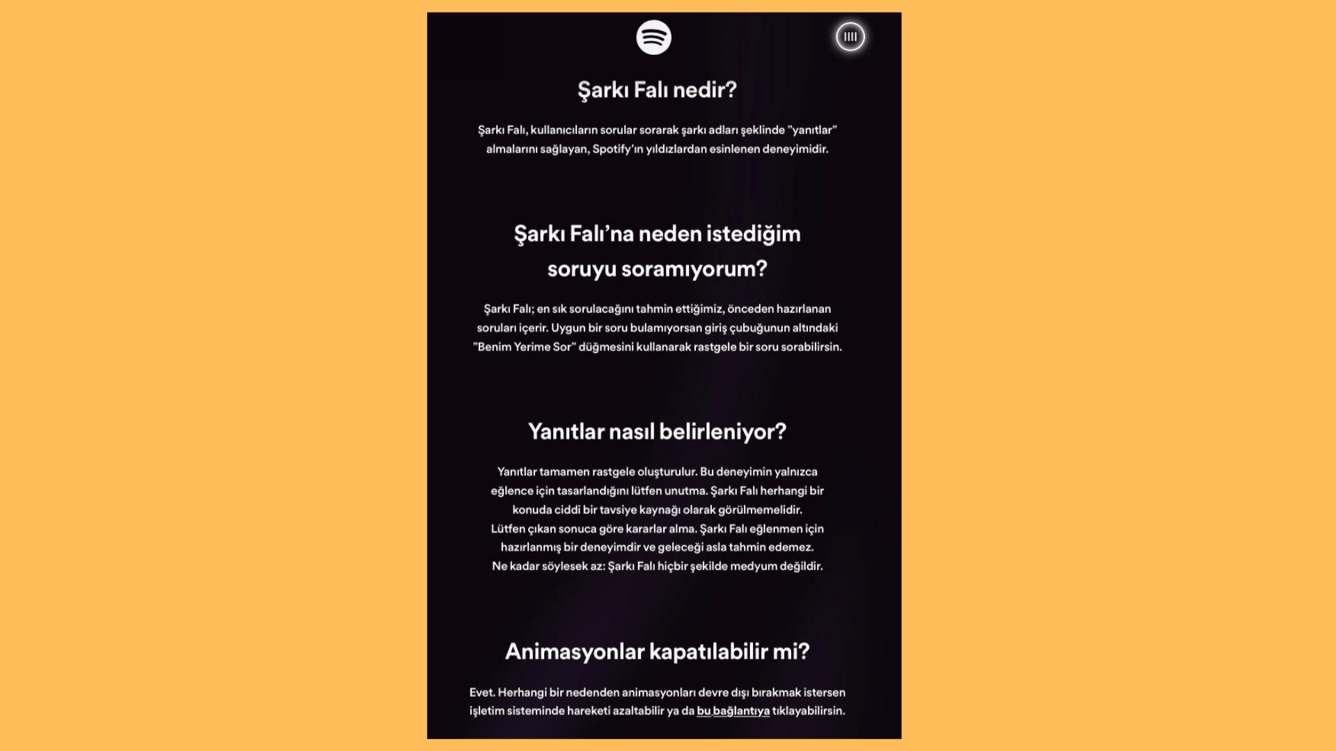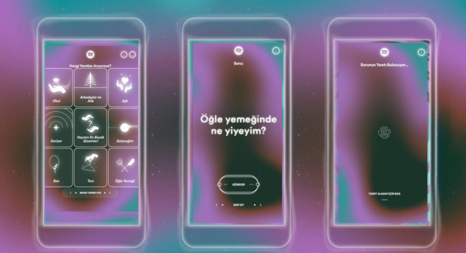Spotify yeni özelliği ‘Şarkı Falı’ ile karşınızda. Kullananların sordurulmuş olduğu sorulara şarkılarla cevap veren bu garip ve mistik özellik, (platformun açıklamasına nazaran) keyifli bir müzik deneyimiyle sarmalanmış bir ‘kozmik rehberlik’ sunmayı amaçlıyor.