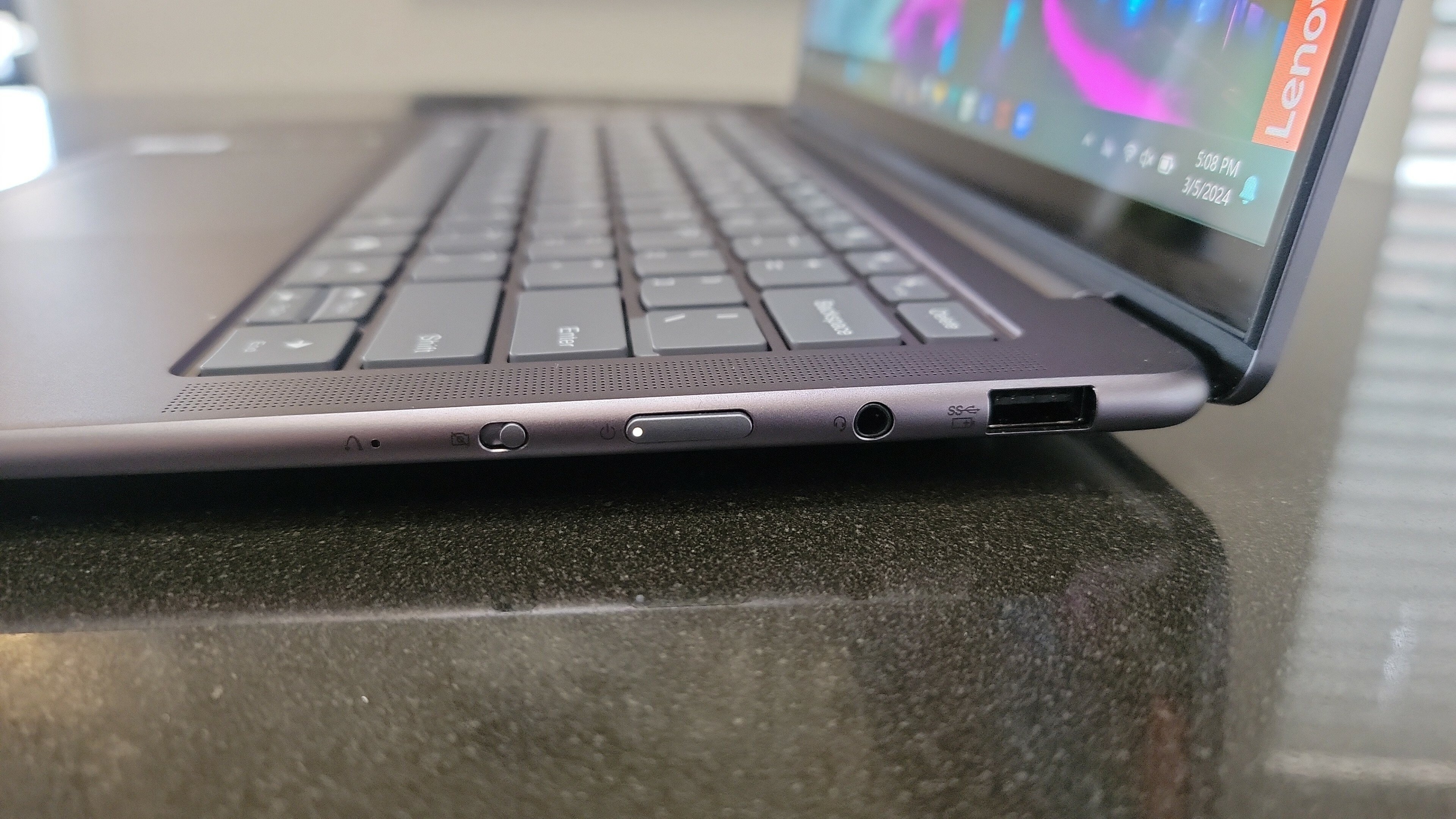 Fotoğraf: Sarah Chaney / MashableCihazın sağ tarafında bir tane USB-A 3.2 yuvası, 3.5 mm’lik kulaklık/mikrofon girişi, güç tuşu ve web kamerası açma/kapama tuşu bulunuyor. Bununla beraber akıllı telefonunuzun SIM kart çıkarma iğnesini kullanarak, bu bölümde bulunan Lenovo Reset Recovery anahtarını da açmanız mümkün.