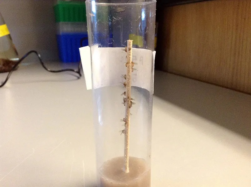 Deneylerde yabani meyve sineklerini yakalamak için yem olarak çürük meyveler koyuldu ve karınlarında beyaz tüylü sporlar olan, kanatları yukarı kalkmış bazı ölü sinekleri görünce şaşırdı. Sporlardan hızla DNA dizileri çıkardı ve tahminini doğruladı: Bu meyve sinekleri E. muscae‘nin kurbanıydı.