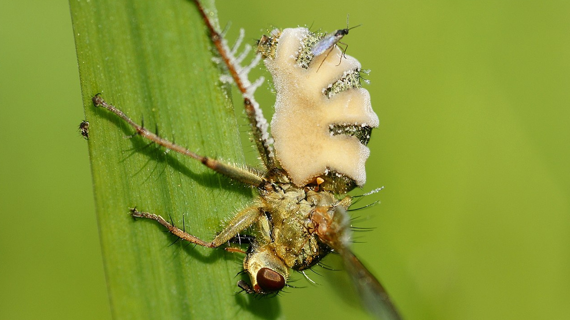 Bu sinekleri saran beyaz madde, açıkça “böcek yok edici” anlamına gelen Entomophthora muscae adlı bir mantar. Tamamen konakçısına bağlı olan ve sinekleri enfekte ederek onları kendi isteğini yerine getiren “zombilere” dönüştüren bir patojen.
