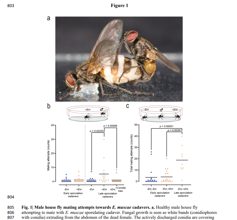 Mantarın dişi sinek karkaslarını sıhhatli erkekler için çekici hale getirerek sinekleri iyi mi manipüle ettiğini özetleyen raporlar De Fine Licht’in bilhassa ilgisini çekti. Sıhhatli adam sinekler uçarak geliyor, enfekte olmuş cesetlerle çiftleşmeye çalışıyor ve o esnada derhal kendileri de enfekte oluyor. “Bu ölümcül cazibenin” doğasını araştırmak için De Fine Licht ve ekibi, kimyasalları çıkarmak ve çözümleme etmek suretiyle, enfekte olmuş ve enfekte olmamış sinek karkaslarını parçaladı ve cesetleri çevreleyen havayı çözümleme etti. 2022’de mantarın erkekleri cezbeden uçucu kimyasallar saldığını keşfettiler.